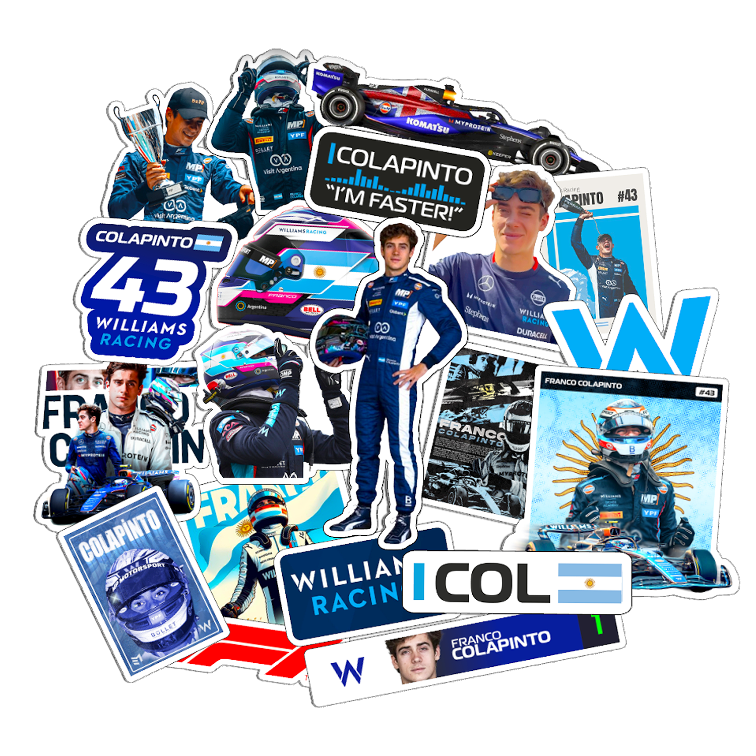 Si eres un verdadero fan del automovilismo y seguidor de Franco Colapinto, ¡este pack de 20 stickers es perfecto para ti! Diseñado para quienes desean llevar su pasión a donde vayan, el pack ofrece una amplia variedad de diseños exclusivos que capturan el espíritu y estilo de este joven talento argentino en las carreras internacionales. Colapinto es una de las promesas más destacadas del automovilismo argentino, ganando popularidad por su habilidad y determinación en cada competencia. Ahora, con estos stickers, puedes mostrar tu apoyo y admiración por este piloto en cualquier lugar.